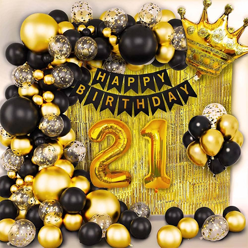 21:a ballonggirlandbågeuppsättning: Denna 21:a ballonggirlandbågeuppsättning är huvudfärgerna svart, guld, silver, etc., vilket är mycket lämpligt för män och kvinnor som dekorationer på 21-årsfesten. De kan hängas på dörren eller väggen, och är också mycket lämpliga för inomhus- och utomhusbruk för att skapa en unik 21-årsfest för män eller kvinnor.