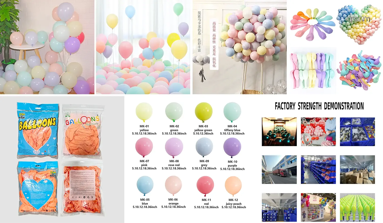 Fabrik i världsklass: Rent rum och helautomatiserad produktionsverkstad, daglig produktion på mer än 1 miljon, 5 tum makaronballonger och andra kategorier (såsom 10-tums, 18-tums, 36-tums, aluminiumfolieballonger, tryckta ballonger) för att säkerställa stabil leverans och snabb leverans.