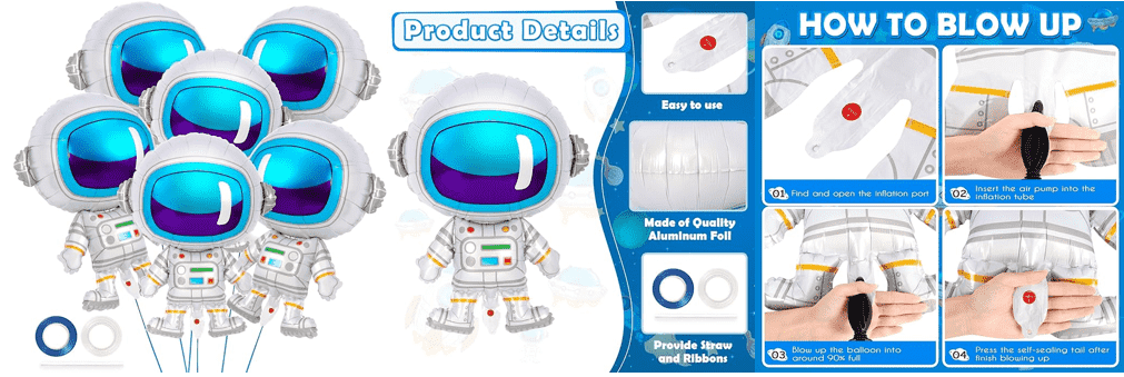 Astronaut folieballongär en slags ballong med bilden av astronauter som tema, vanligen använd för festdekorationer, festivalupplägg och andra tillfällen. Tillverkat av aluminiumfoliematerial, detta material har god lufttäthet, kan upprätthålla ett uppblåst tillstånd under lång tid, är färgglatt och inte lätt att blekna, är säkert och giftfritt och kan återanvändas.