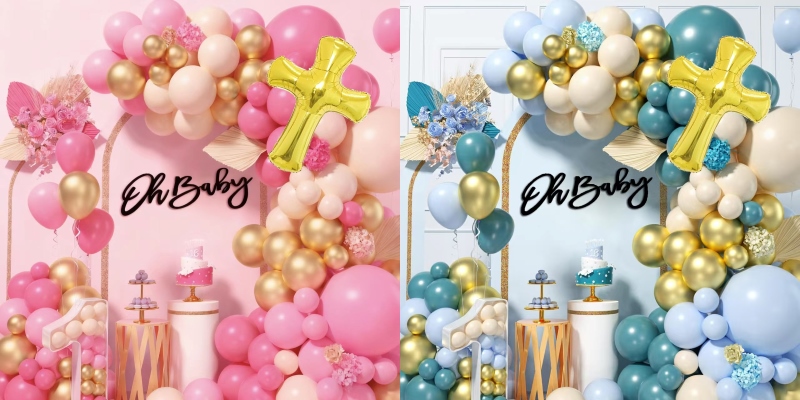 Baby shower ballong arch kits har två stilar, en stil är för baby flickor och en stil är för baby boys. Baby girl set är gjord av macaron rosa färg ballong, matt ljus ros färg ballong, matt ljus hud färg ballong, metallisk guld färg ballong och ett guld gud välsigne kors. Baby boy-setet är gjort av macaronblå färgballong, retro havsblå färgballong, matt ljus hudfärgsballong, metallisk guldfärgad ballong och ett guld gud välsigne kors. Båda har limprick och ballongresa, du kan använda dem för att göra en hel vacker krans.