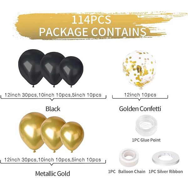Våra svarta och guldiga ballongbågesatser kommer med en komplett uppsättning verktyg, såsom band, ballongbågeband, prickklistermärken, etc. Och varje set kommer med relevanta bruksanvisningar för lättunderhållbara ballonggarlandbågesatser och kan hjälpa dig att snabbt sätta ihop dina ballonggarlandbågesatser som är lämpliga för olika fest- och festivalscenarier.
