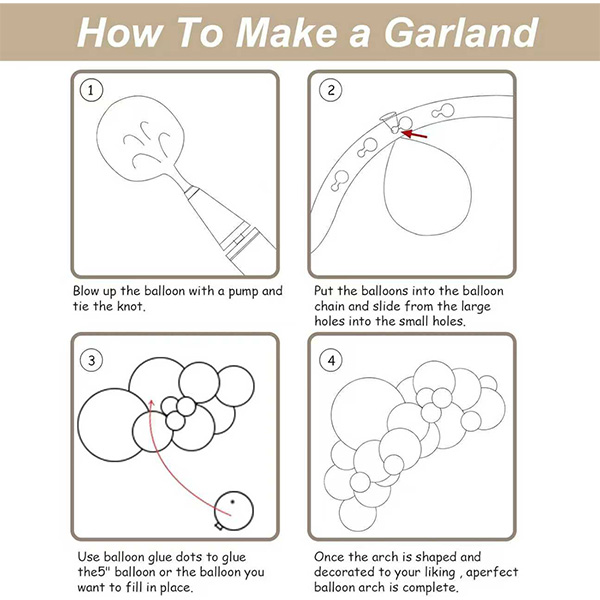 2. Matcha ballonger i olika storlekar. För närvarande kan vi dekorera med ballonger i olika storlekar för färgglada ballonggarlandbågar. För närvarande finns våra bästsäljande stilar tillgängliga i 5 tum, 10 tum, 12 tum, 18 tum och 36 tum.