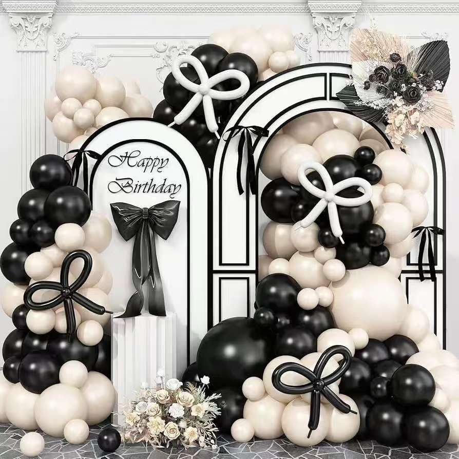 Denna bågballongbåge Garland finns för närvarande i olika ballongfärger. Den senaste vita och svarta ballongbågen är ett populärt val bland kunderna, eftersom det är den mest populära färgen. Den vita och svarta ballongkransbågen är vackert med en lycklig födelsedagsbakgrund. Bågen accenter förbättrar den övergripande födelsedagsfestballongbågen och lägger till en touch av glitter och charm till ditt parti.
