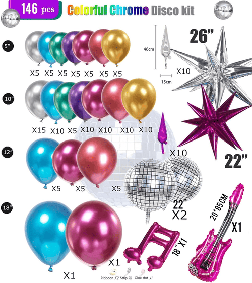 De olika storlekarna och färgerna på ballongerna har skapat en mycket komplex lagereffekt för detta kit, vilket kan dra till sig mycket uppmärksamhet för ditt evenemang. Den är mycket lämplig för discofester, musikevenemang, födelsedagsfester och så vidare. Också eftersom K-pop-musikkulturen blir mer och mer populär i världen, kan du göra detK-pop disco ballong arch kitgenom att lägga till flera dekorationer i K-pop-stil, såsom bakgrunds- eller folieballonger. Eller lägg till födelsedagsdekorationer för att göra discoballongers födelsedagsdekorationskit.