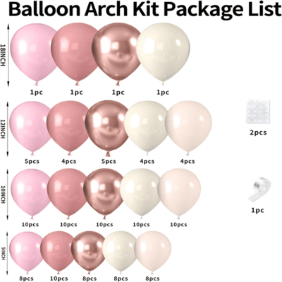 Dammrosa ballong litet kit:Detta lilla kit består av 50 till 80 st rosa ballonger. För att förstärka uppsättningens lagereffekt kan du också lägga till vita ballonger, aprikoser och genomskinliga ballonger. Använd helium för att fylla dem och sedan kan du använda ett band för att knyta och sedan låta dem sväva upp i luften.