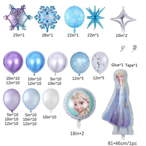 Folieballongerna är huvuddelen av ballongbågsetet med Frozen-tema. De inkluderar främst Princess head porträtt folieballong, snögubbe folieballong. Sifferfolieballongen och bokstavsfolieballongen kan också läggas till för att skapa en högre feststämning som om du vill ha dekorationer i födelsedagsfesten.