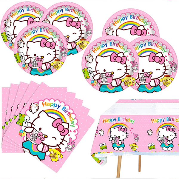 3) Servis: Hello Kitty-servisen kan fortfarande kombineras med de unikt mönstrade designerna av de rosa och vita festtillbehören för att skapa en söt atmosfär för din fest. Alla produkter är mycket hållbara, färgglada och har en högkvalitativ känsla.