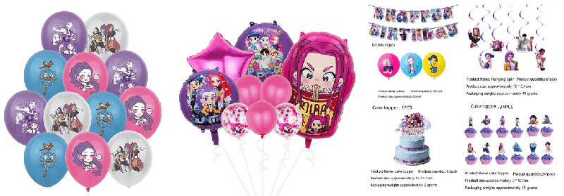 Det innehåller främst Demon Hunters-tematryckta latexballonger, folieballonger, etc., som matchas med ballonger och ballongtillbehör i samma färgsystem, inklusive födelsedagsflaggor i papper, tårtpluggar och andra produkter tryckta med klassiska bilder av Demon Hunters. Produkterna har hög färgmättnad och är inte lätta att bleka. Säkra och miljövänliga material används och kanterna är rundade för att förhindra att barn råkar repa sig medan de leker, och säkerhetskraven vid familjefester beaktas. Produkten är lämplig för en mängd olika scener, oavsett om det är ett barns födelsedagsfest eller en fanfest, den kan möta behoven av en uppslukande layout.