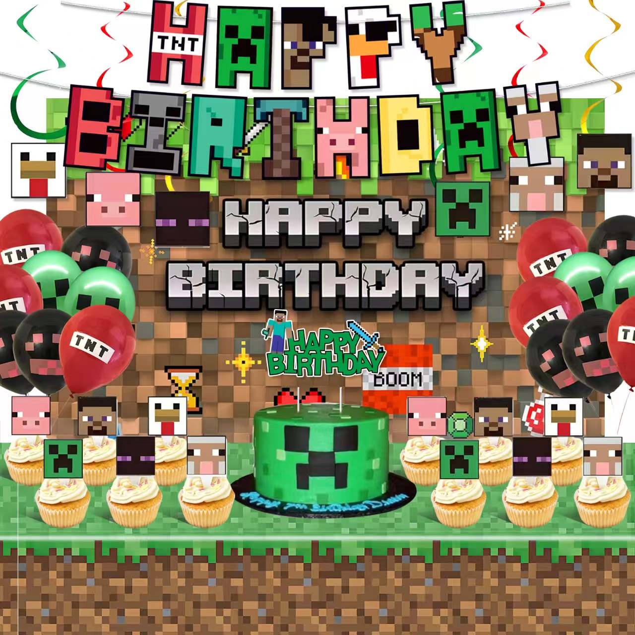 Objekten kan matcha efter tema. Minecraft -bordsduken kan gå med bordsartiklar i samma stil. Minecraft -bordsduken kan gå med bakgrund av samma stil. Minecraft -bordsduken kan gå med banner i samma stil. Uppsättningen kan lägga till gröna latexballonger. Uppsättningen kan lägga till bruna latexballonger. Uppsättningen kan lägga till pixelfolieballonger. Partiet ser ut som en blockvärld.