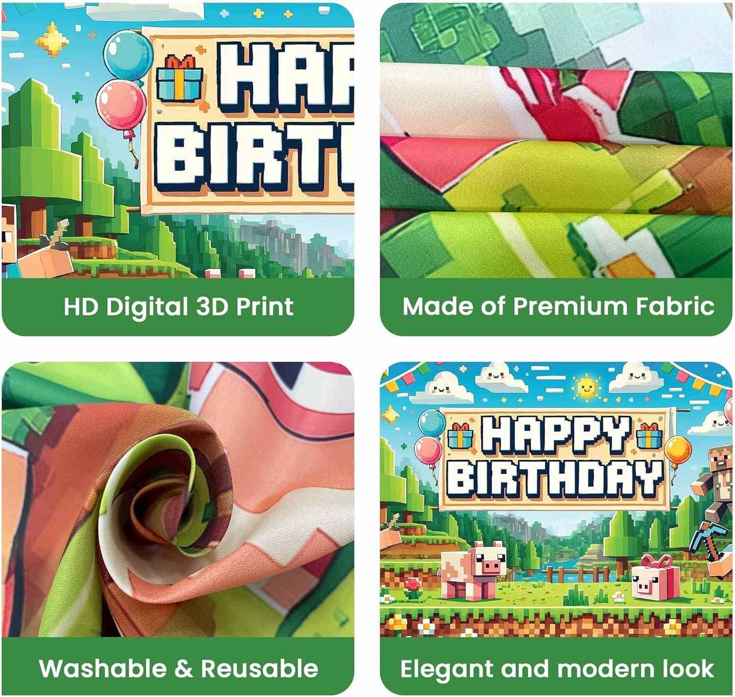 Minecraft -bakgrunden är den viktigaste visuella delen av festscenen. Designen tar idéer från klassiska speldelar. Det visar pixelhimmel, gräs, träd, byggnader och Steve. Dessa delar går med för att göra en helblockvärldsscen. Bilden har ljus färg. Bilden har rika lager. Orden Grattis på födelsedagen i pixelstil ser tydliga ut. Orden fångar ögat. Bakgrunden får festplatsen att känna sig som ett spelland på en gång.