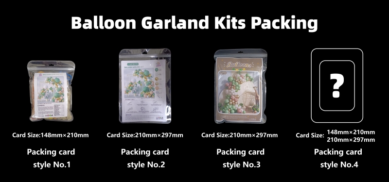 Den andra är OPP-påsar med ett papperskort. Vi erbjuder två stilar av papperskort; du kan välja din favoritdesign eller skapa din egen. Denna förpackning är bättre lämpad för offlineförsäljning, till exempel i stormarknader. Ballongbuntarna kan hängas på hyllor eller ställas ut på diskar. Papperskortet inuti låter kunderna tydligt se stilen på paketet.