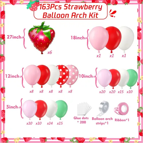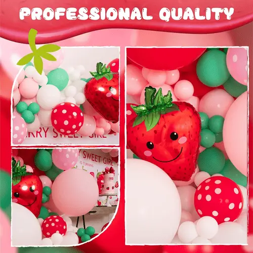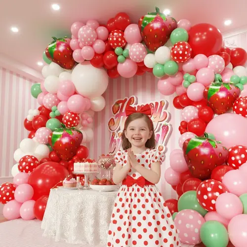Ballonggirland med jordgubbstema är sammansatt av högkvalitativ latexballong och folieballong. Det mest framträdande föremålet i satsen är 27-tums jordgubbsfolieballongen. Utöver det är latexballongerna i den också en viktig del. Latexballongerna i satsen är i olika färger och storlekar, vilket kan skapa vackra lager. Latexballongens färg är macarronrosa, mattröd, matt djuprosa, retro elfenbensvit.
