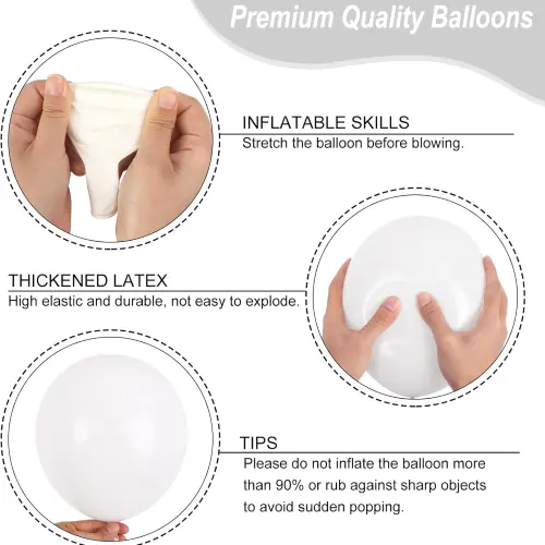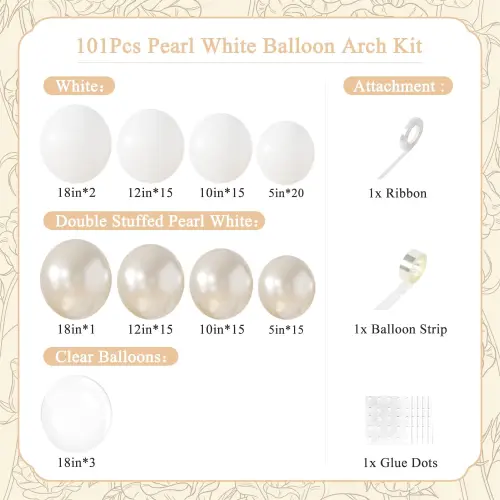 Det finns ballongprickar, ballongremsa, band, ballongband i varje vit bröllopsballongbåge. Alla är noggrant matchade för att skapa en vacker och sammanhållen bröllopsdekorationseffekt.