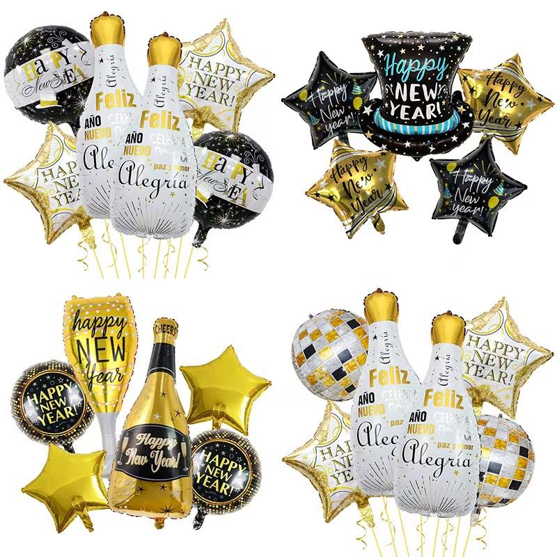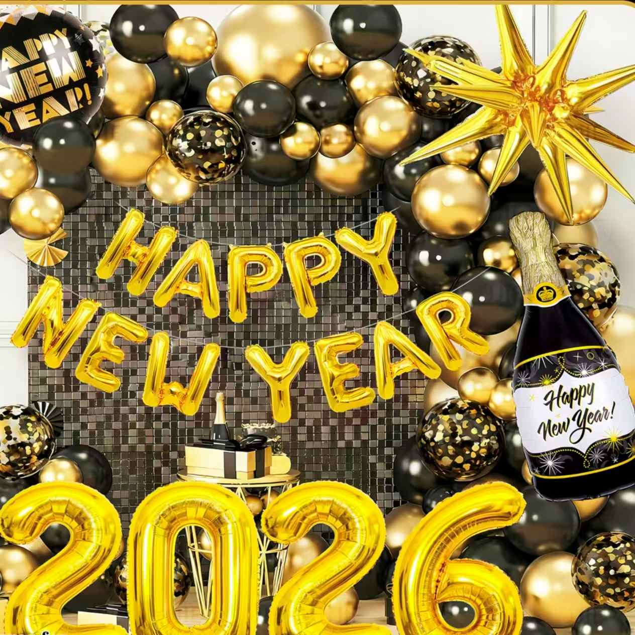Tänk på uppsättningen med nyårstema. Den har folieballonger som ser ut som champagneflaskor. Den innehåller också "2026" nummerballonger, dekorativa stjärnballonger och mer. Huvudfärgerna är svart-guld eller guld-vit. Den är full av nyårsjubel. Det kan enkelt göra en lyxig och ceremoniell nyårsfestscen.